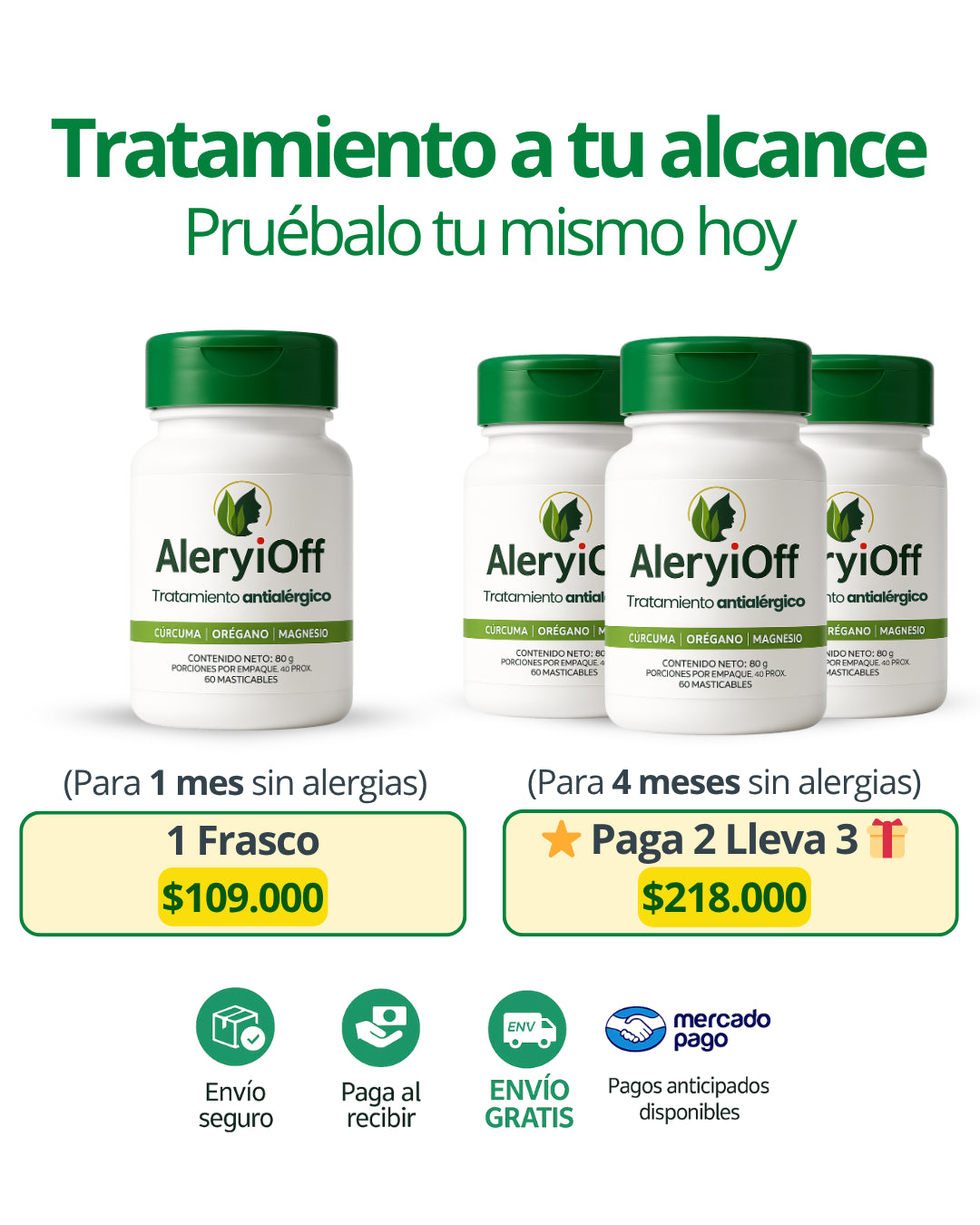 AleryiOff™ la elección de miles de Colombianos que buscan controlar sus alergias de forma efectiva, segura y natural. Respaldado por evidencia científica y registro sanitario INVIMA.